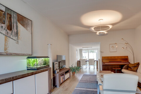 De woonkamer is voorzien van een mooie laminaatvloer en is speels ingedeeld met een leefgedeelte centraal in de ruimte. Aan de achterzijde loopt dit over naar een eetgedeelte met lichte, moderne (half)open keuken met inbouwapparatuur.
