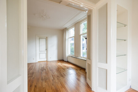 Binnenkomst in de hal. Vanuit de hal is de woonkamer te betreden. Deze is authentiek en beschikt over ensuite deuren. De woonkamer is licht door de vele ramen. Vanuit de woonkamer is de keuken te betreden. De keuken is voorzien van alle inbouwapparatuur. De keuken biedt toegang tot het balkon. Op deze etage zijn twee slaapkamers gelegen. De ruime slaapkamer aan de achterzijde is voorzien van een inbouwkast. Tevens bevindt zich op deze verdieping een badkamer voorzien van douche, toilet en wastafel.