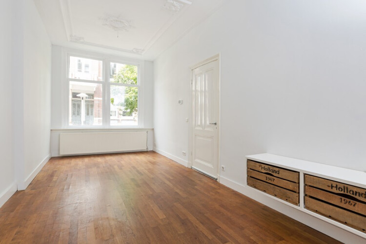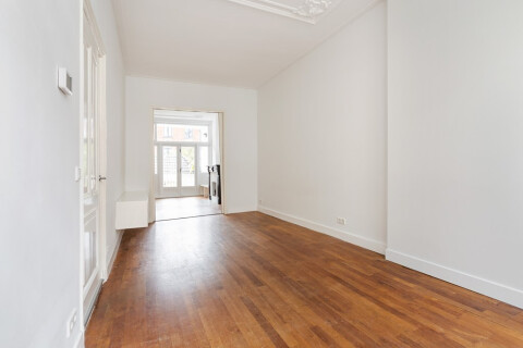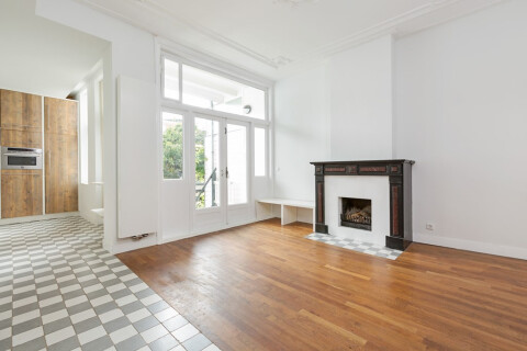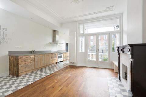 Je komt de woning binnen op de beletage, Je stapt hier binnen in een zeer mooie en brede kamer-en-suite met hoge plafonds en originele ornamenten. Aan de achterzijde is een openhaard met nog de originele schouw. Via de openslaande deuren kom je op het balkon met vrij zicht op de tuin. De open keuken is luxe afgewerkt en voorzien van de nodige moderne apparatuur om heerlijk uitgebreid te koken.